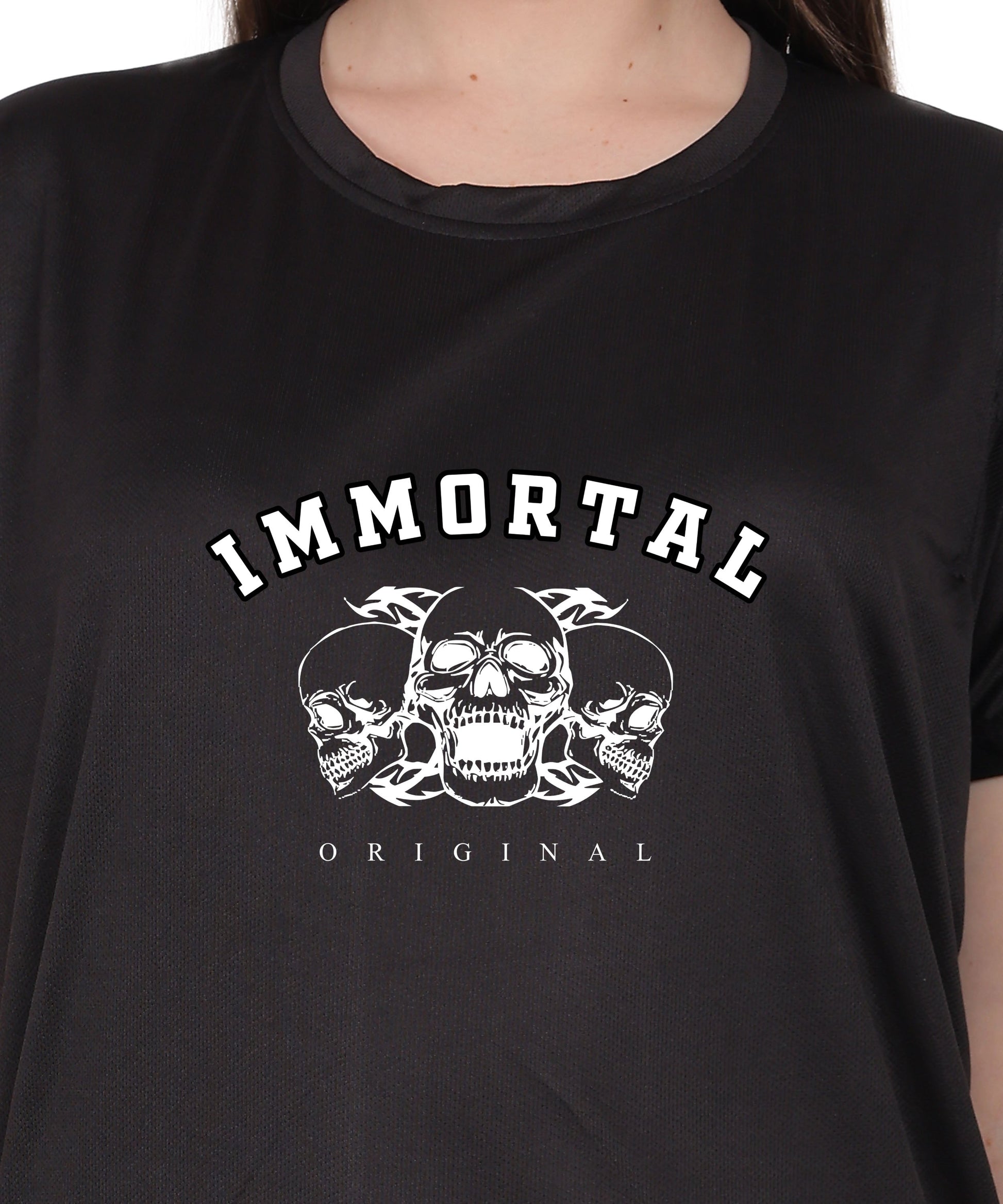 Make a bold statement with this striking red t-shirt featuring the iconic 'IMMORTAL' skull design. This eye-catching graphic t-shirt combines style with comfort, perfect for everyday wear. Crafted from premium cotton jersey fabric, it offers excellent breathability and durability. The classic crew neck and short sleeve design provide a timeless silhouette that suits various casual occasions. The screen-printed graphic maintains its crisp appearance through regular washing, while the 70 cm length offers ideal hip coverage. With its regular fit and straight hemline, this t-shirt complements any body type and pairs perfectly with jeans or casual bottoms. The vibrant red colour serves as an excellent backdrop for the striking skull graphic and text design. Practical features include a comfortable pull-over style and easy care instructions - simply machine wash cold and tumble dry low. This 200-gram t-shirt combines comfort and style in one versatile piece, measuring 55 cm in width. Whether you're heading out for casual outings or daily activities, this graphic t-shirt delivers both comfort and visual impact. The cotton jersey material ensures lasting comfort throughout the day, making it an essential addition to any casual wardrobe.
